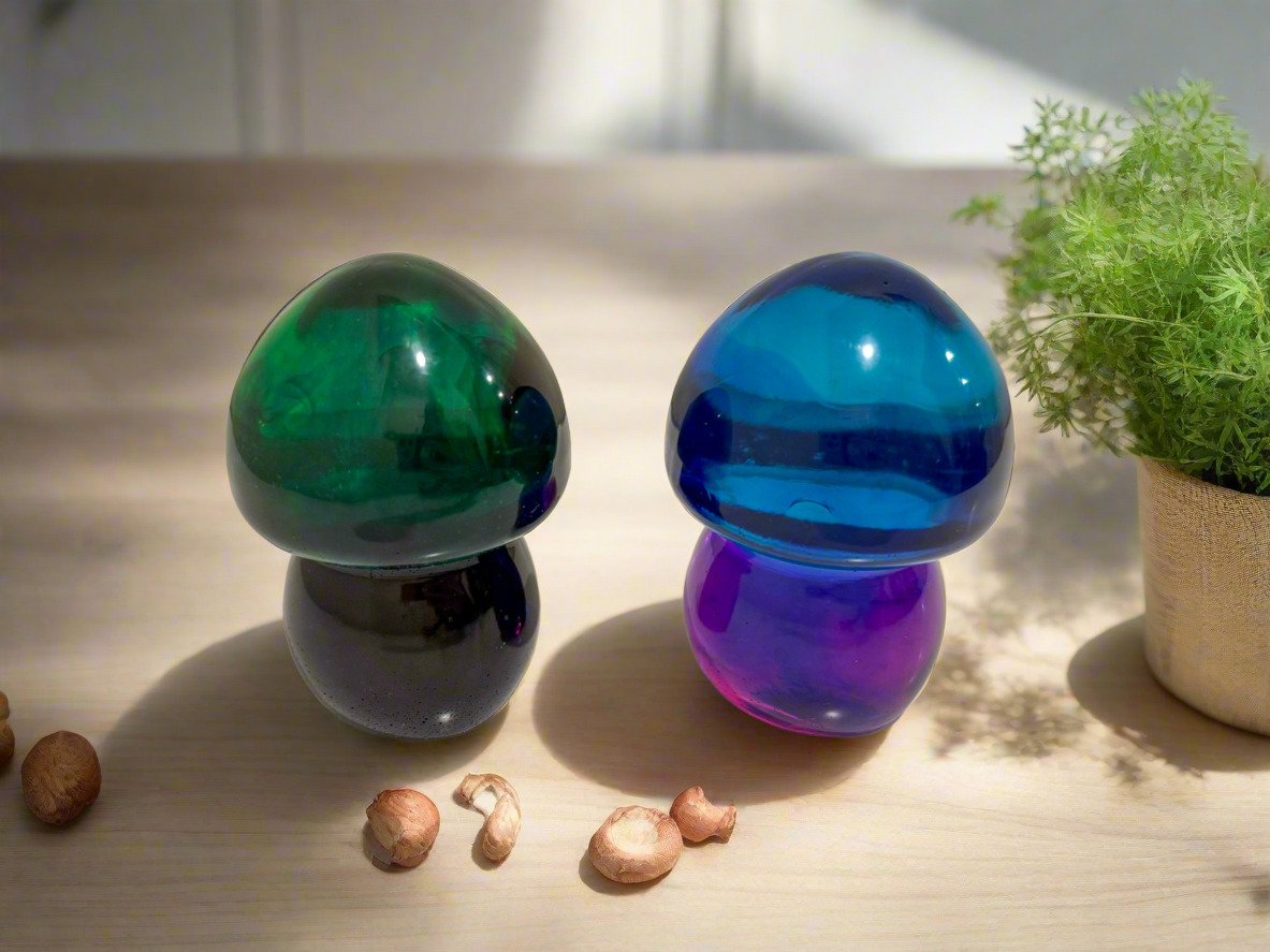 Medium sized mushroom approximately 3 inches in height and 1 inch wide. Made of epoxy resin.