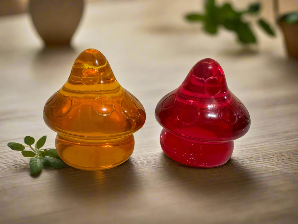 Mushroom made of epoxy resin. Approximately 3 inches tall and 3 inches wide.